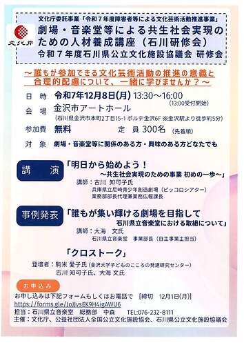 トップページ > イベント情報 > 劇場・音楽堂等による共生社会実現のための人材育成講座(石川研修会)